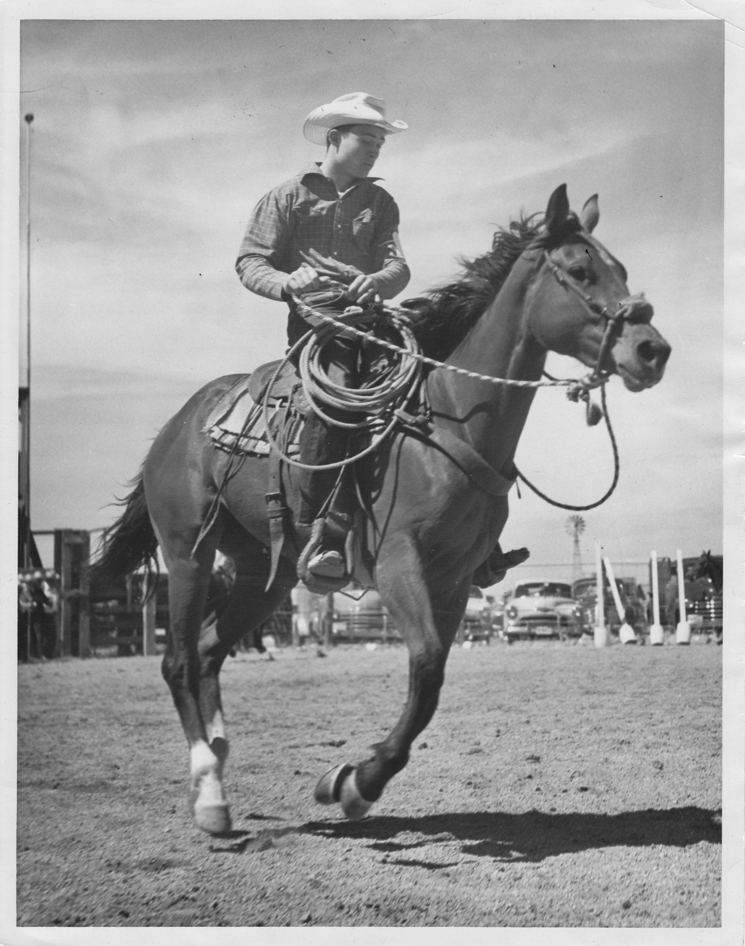 l: Bob performing on horseback during a 4-H competition in Sonoita, 1950.